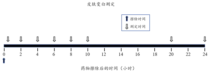 研究中设立未经治疗的对照部位(UNT),用于校正活性药物作用部位的皮肤颜色变化。需设定一系列适当的给药持续时间梯度(如0.25~6.0小时,具体范围可根据所研究的皮质类固醇调整;见下图)。在清除皮肤残留药物后,于每个给药时间点结束时,使用分光光度计测量皮肤反应,并计算效应曲线下面积(AUEC)来量化药效学响应。