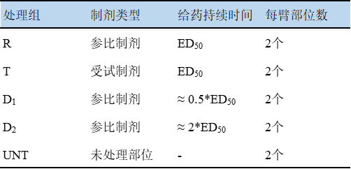 采用探索性研究确定的 ED50值作为受试制剂(T)与参比制剂(R)的单次给药持续时间。此外,关键性研究中还应包括参比制剂的每个给药持续时间(D1和D2)的重复。