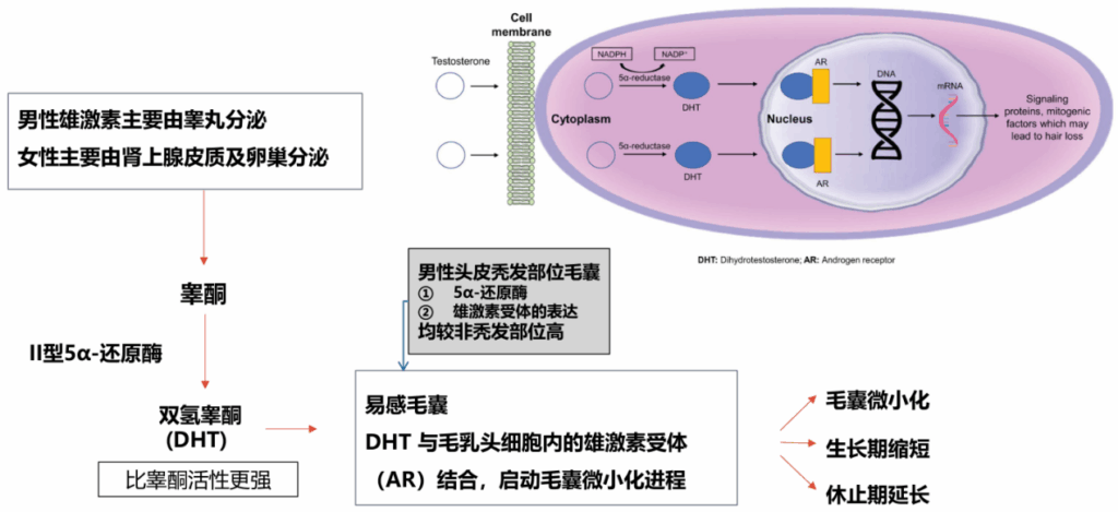 - 同时,DHT-AR信号还会引起毛囊真皮乳头细胞分泌一系列生长因子和炎症介质,最终导致毛囊微型化和纤维化。