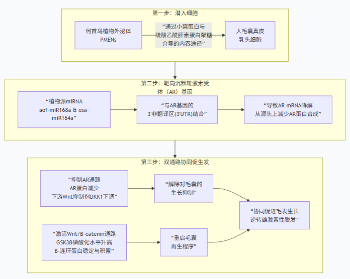 何首乌(Polygoni Multiflori Radix)在中医中长期用于治疗脱发和白发。现代研究已发现其含有二苯乙烯类、蒽醌类等活性成分,但其完整的作用机制,特别是植物外泌体的作用尚未被充分探索。植物外泌体样纳米颗粒(PENs)作为天然纳米载体,可能通过携带植物miRNA实现跨界基因调控,但其在人类生理中的作用未被充分探索。