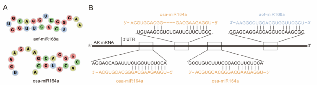 - 靶向沉默:这是机制的核心。高通量测序发现PMENs中富含的aof-miR168a和osa-miR164a与人类AR基因3’非翻译区存在高度互补性(如图2),预示强大的结合潜力。 aof-miR168a 和 osa-miR164a能像“精确制导导弹”一样,直接找到并结合导致AGA的核心祸首——雄激素受体(AR)基因的3’非翻译区(3’UTR)。这种结合导致AR的mRNA被降解,从源头上减少了“致病指挥官”(AR蛋白)的数量。实验证实,PMENs处理可使毛囊细胞中AR蛋白水平最高下降23.2%。