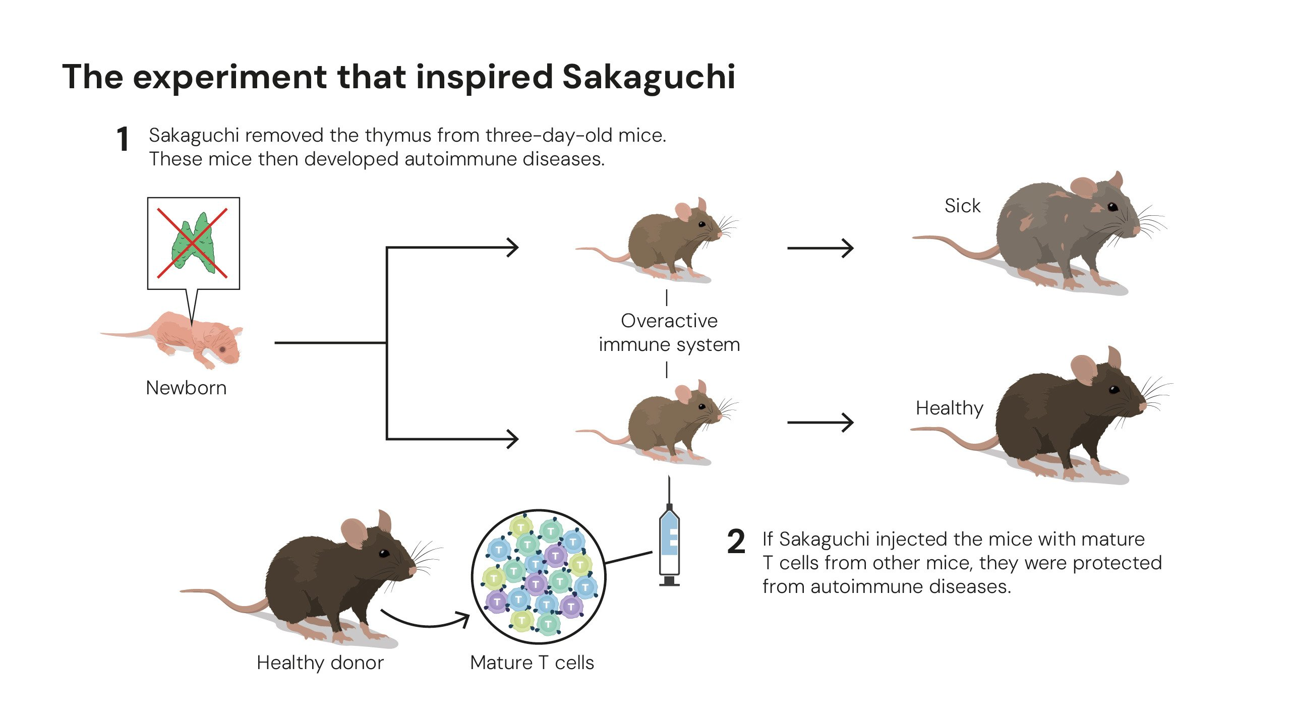 坂口的灵感来自于同事们早期进行的一项结果相互矛盾的实验。为了了解胸腺在T细胞发育中的作用,他们对新生小鼠进行了胸腺切除手术。他们推测,这些小鼠会产生更少的T细胞,免疫系统也会更弱。然而,如果在小鼠出生三天后进行手术,其免疫系统就会过度活跃并失控,导致小鼠患上多种自身免疫性疾病。