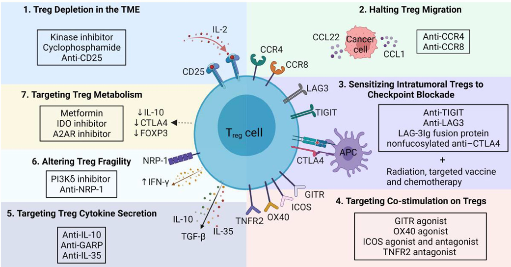 在癌症治疗中,针对Tregs细胞的治疗策略致力于降低其数量或抑制其活性。