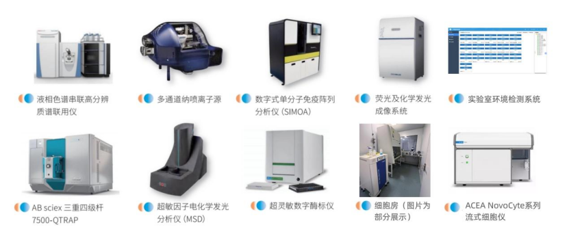 2)大分子检测平台:以ELISA、MSD和SIMOA 为平台,开展治疗性生物制品蛋白及单细胞水平全域灵敏度的分析服务。