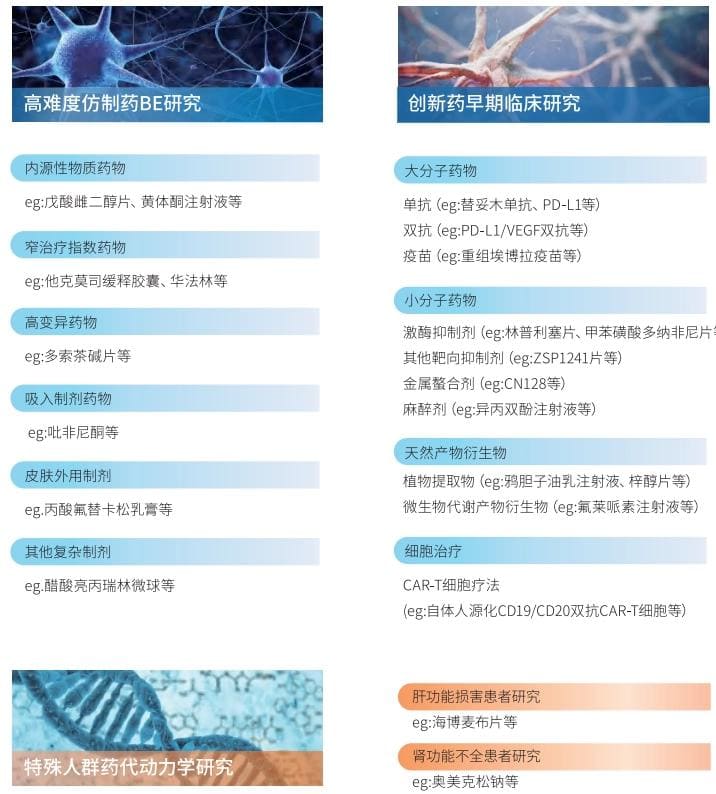 小牛团队已在内源性物质药物、高变异药物、肝肾功能不全特殊人群PK研究及单抗/双抗/CAR-T等多类创新药的临床研究项目中积累了丰富经验。
