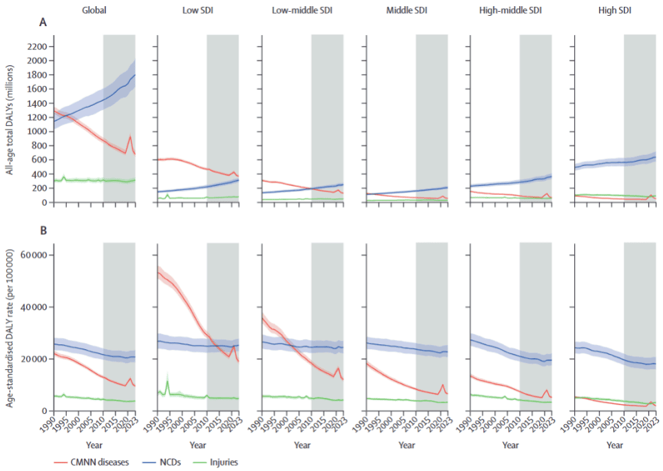 图1:按GBD一级病因和SDI五分位数划分的总伤残调整生命年(A)与年龄标准化伤残调整生命年率(B)趋势,1990–2023年。灰色阴影表示2010–2023年期间。1994年在低SDI及全球面板中可见的伤害相关伤残调整生命年突增主要源于卢旺达种族灭绝事件。2021年和2022年几乎所有图表中传染病、孕产妇、新生儿和营养性疾病的大幅突增反映了COVID-19大流行造成的更大伤残调整生命年影响。均值趋势线周围的阴影区域代表95%不确定性区间。CMNN=传染病、孕产妇、新生儿和营养性疾病。DALY=伤残调整生命年。GBD=全球疾病、伤害和风险因素负担研究。NCDs=非传染性疾病。SDI=社会人口指数。